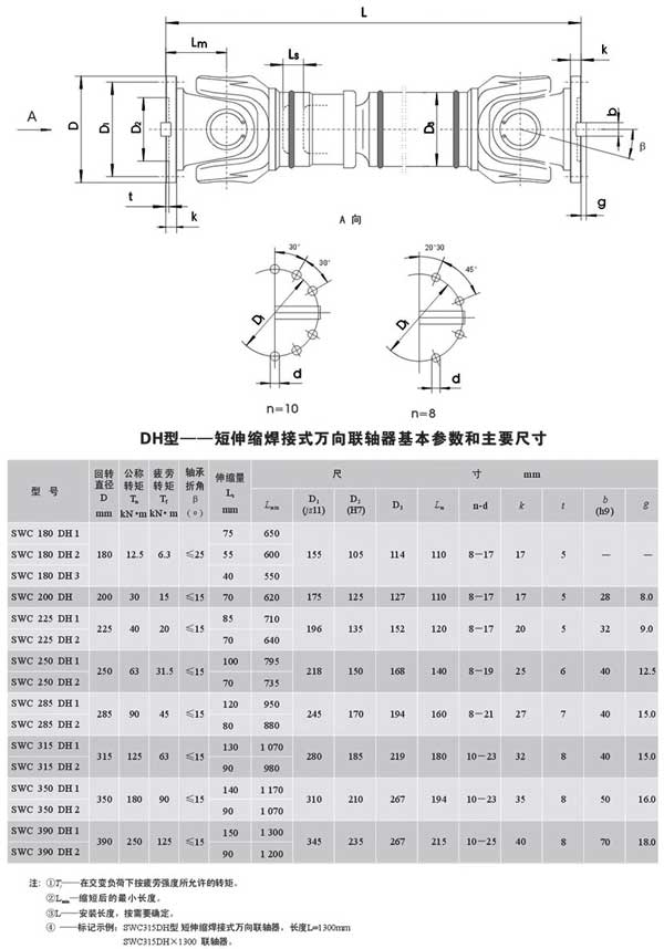 SWC-DH型短伸縮焊接式萬向聯(lián)軸器的共同特點是角向補償量較大,不同結(jié)構(gòu)型式萬向聯(lián)軸器兩軸線夾角不相同,一般≤5°-45°之間。萬向聯(lián)軸器利用其機構(gòu)的特點,使兩軸不在同一軸線,存
